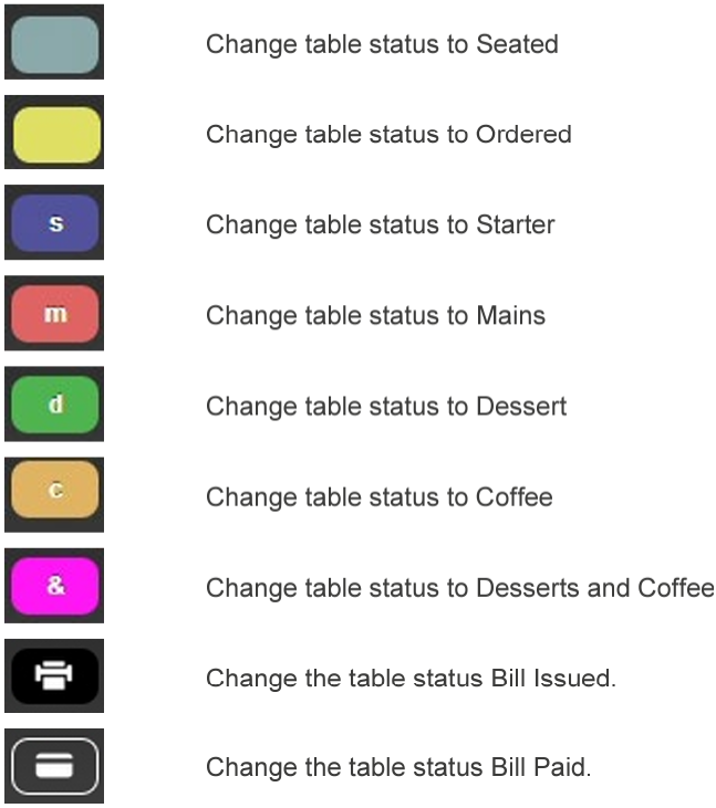 Examples of these buttons are shown in the image below: - When the customer pays the bill at the POS, the system automatically displays a green tick over the £ icon in the information box as shown below.