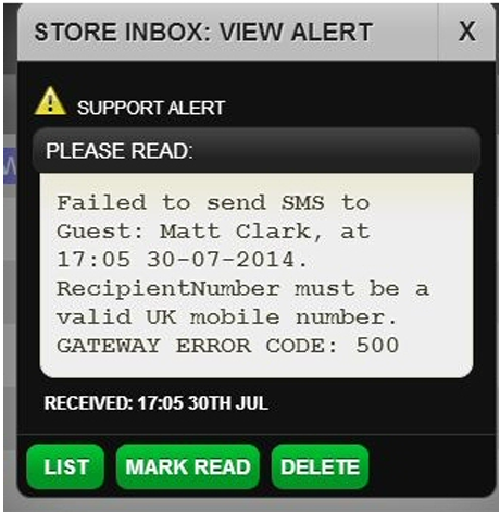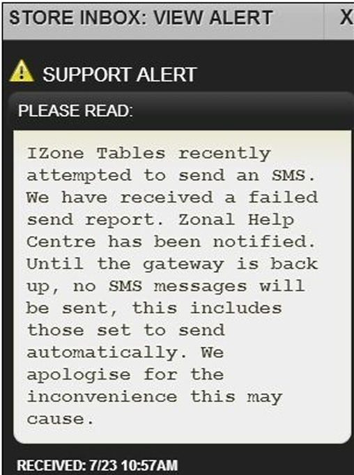 If an SMS message fails to be sent, the following failure announcement is displayed on the host app and a failure report is sent to the Zonal Helpcentre.