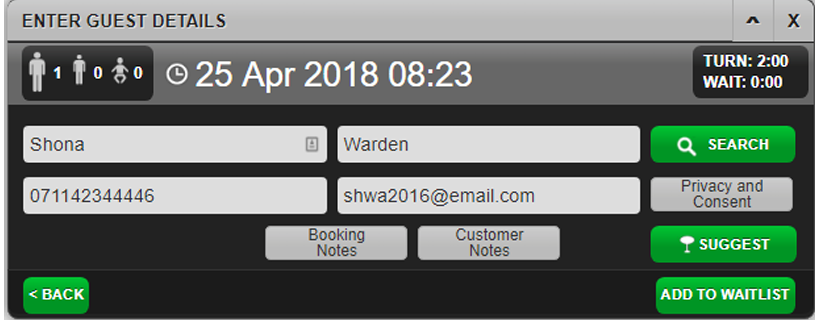 The only differences when adding a returning customer to the wait list are that you start by searching for the customer as described above and when the Enter Guest Details window is displayed it will be pre-populated with the information retained within Tables, for example: