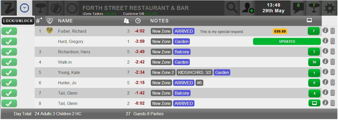 The Wait List allows you to manage the customer experience from arriving on site to being seated. As soon as customers arrive, wait times are recorded so you can see at a glance how long each customer has been waiting.