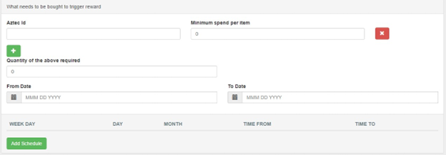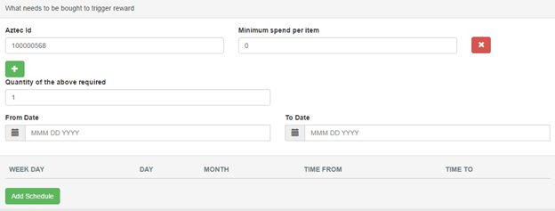 Aztec ID - Enter the Aztec ID of the item that triggers this reward. This number can be viewed in Aztec Product Modelling.
