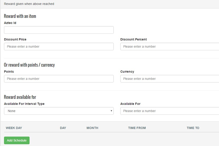 Aztec ID - enter the Aztec ID of the item that is the reward. This number can be viewed in Aztec Product Modelling. If the reward item is a choice from many products, this can be done using a triggered promotional button.