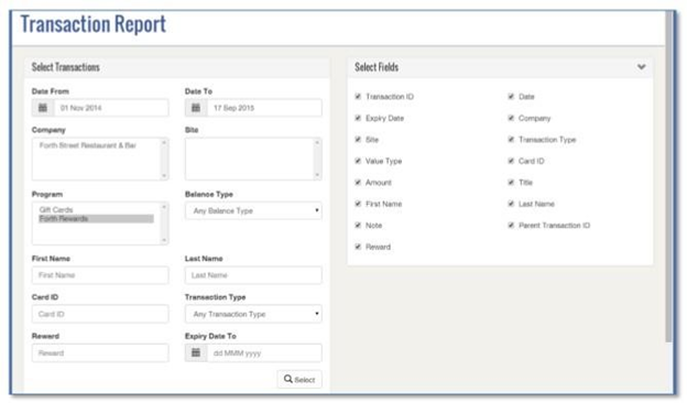 Expiry Date To - This optional field enables the user to filter report information to include only transactions made by cards that expire before the date specified. When all search criteria have been selected, click Select. As always, the information displayed will conform to all criteria chosen and if this is left open in many cases, it may result in a very large report.