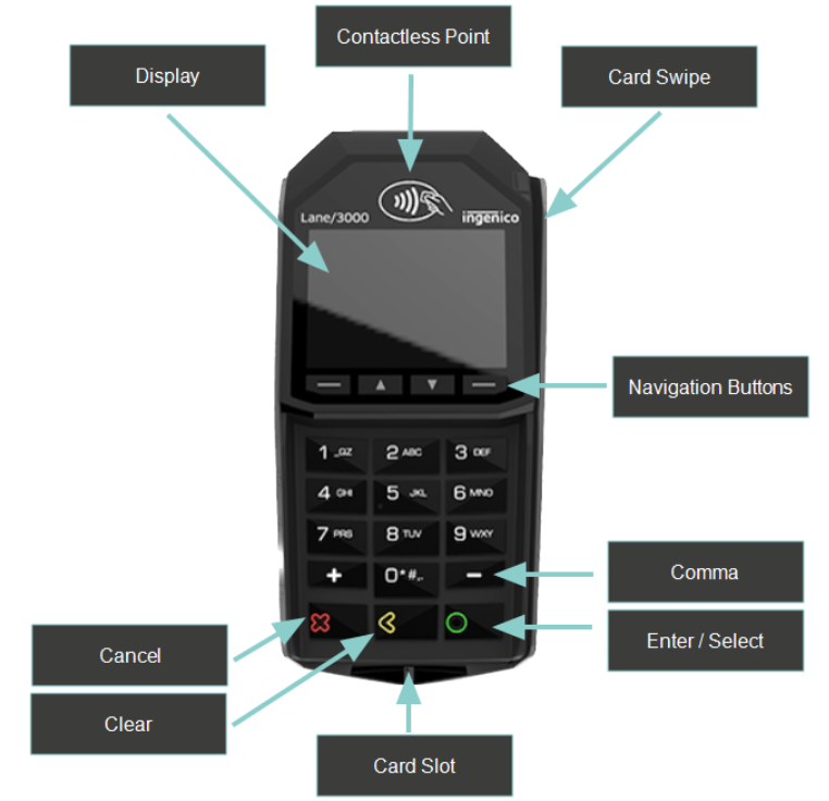 The Lane 3000 device is a fixed PED that is used for transactions that are sent directly from a POS terminal.