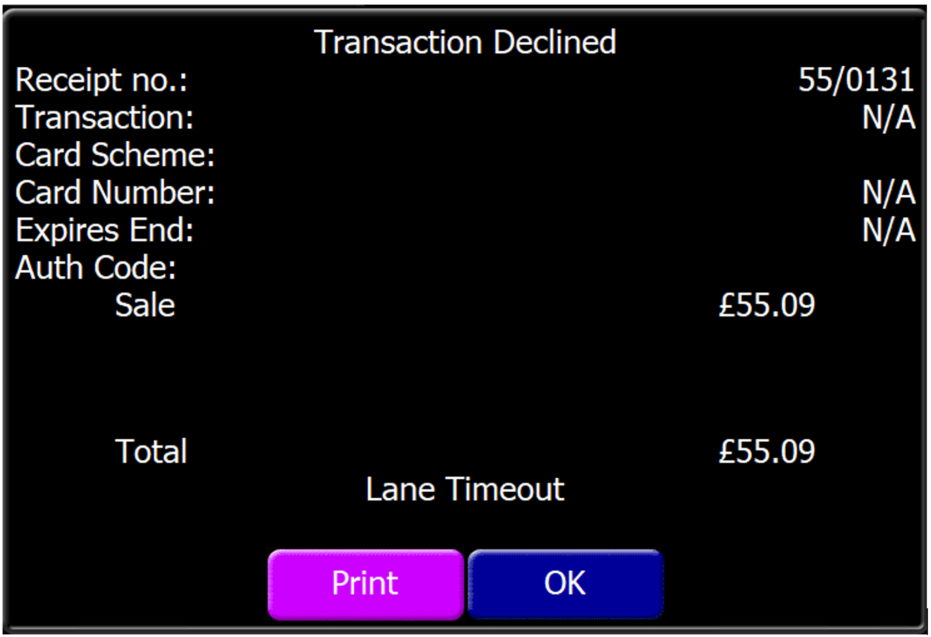 Should the transaction time-out between the POS Terminal and the PED, the following will be displayed: