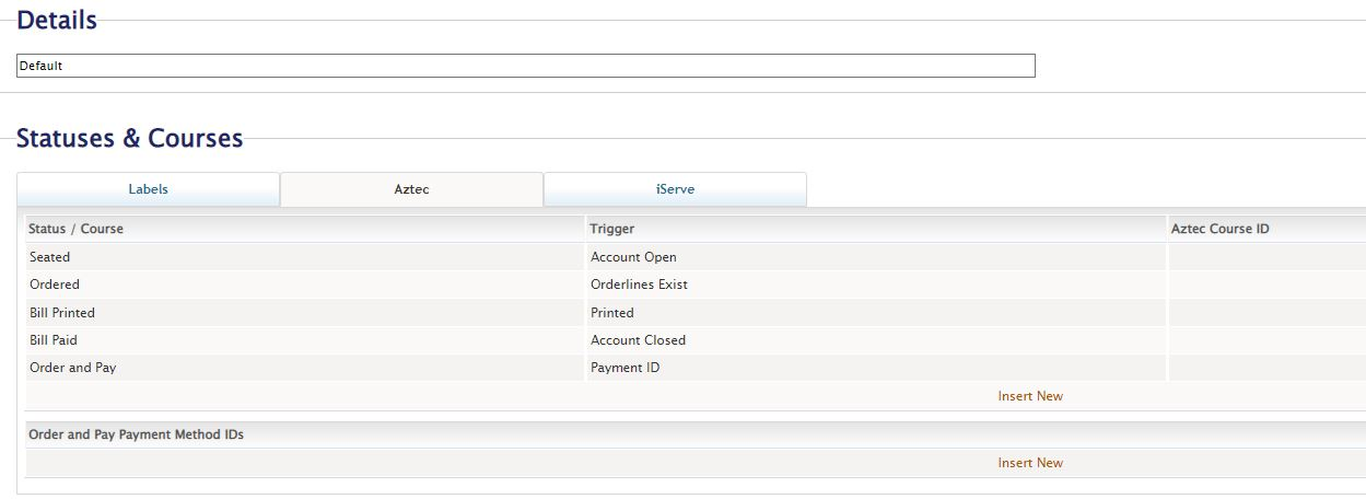 Login to Tables Brand Admin > Brand Setup > Manage Configurations > Edit Configurations > Status and Courses > Aztec