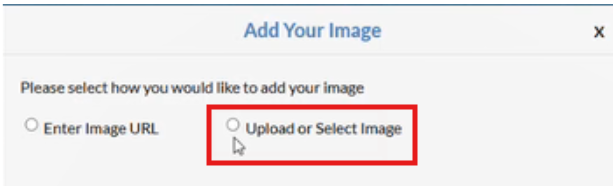 3. This will give you the below options - Select Upload or Select Image (or alternatively click Enter Image URL for an online image).