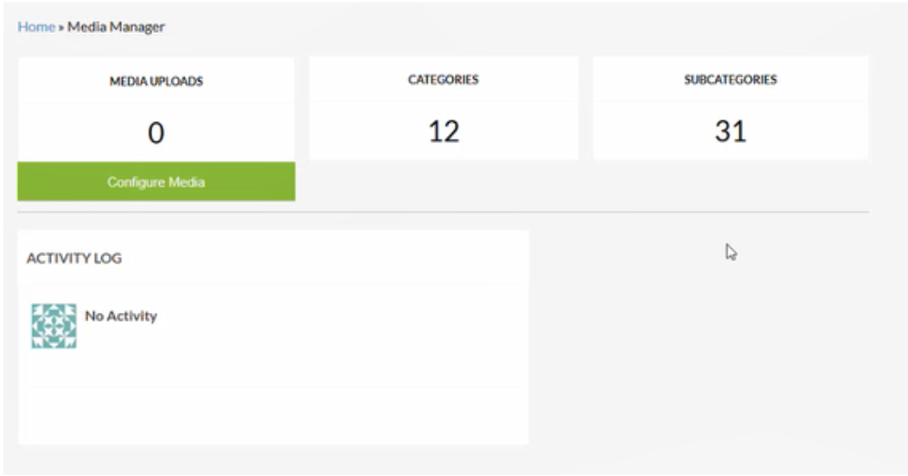 To configure media, select the Configure Media green button, as shown in the above image. This will take us to the below screen, displaying our Media library and what is currently stored in it.