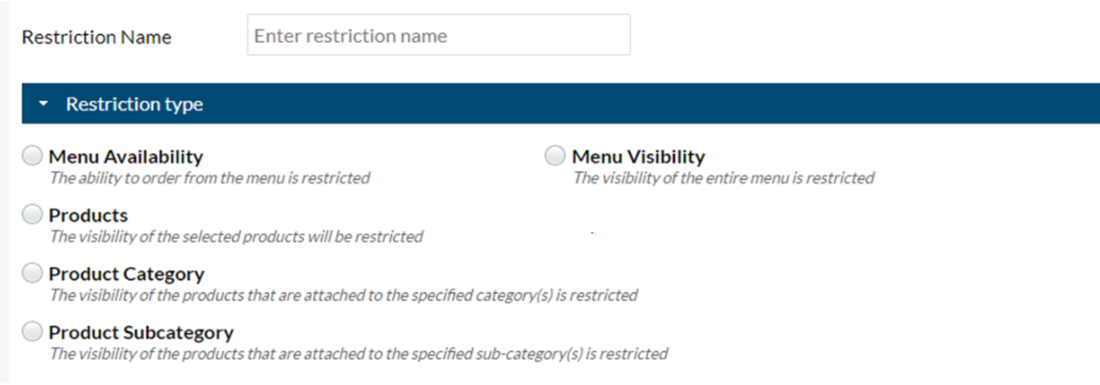 The Restrictions module allows you to create new restrictions and also manage the existing restrictions that are applied to your menus.