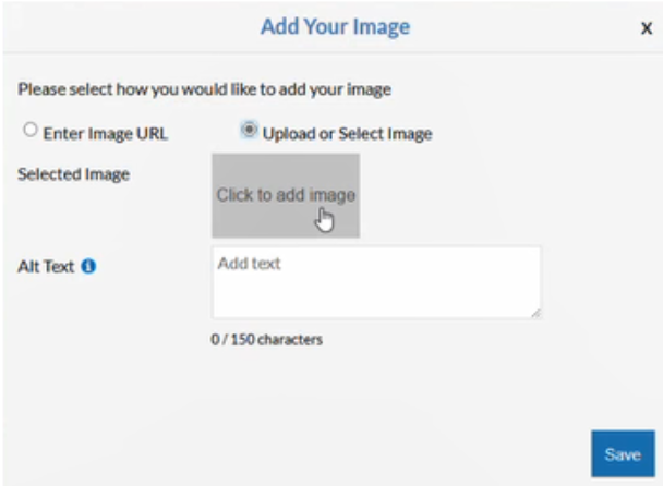 • By selecting Upload or Select Image, the screen will show as below; select Click to add image, which is where you can select an already present image, or upload a new one directly.