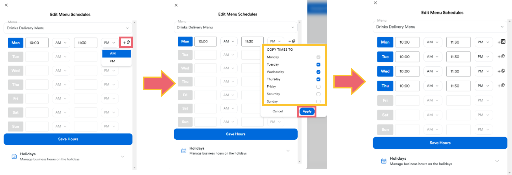 4. If each day operates the same hours for a menu, select the Copy icon to copy the same operating hours to all other relevant days.