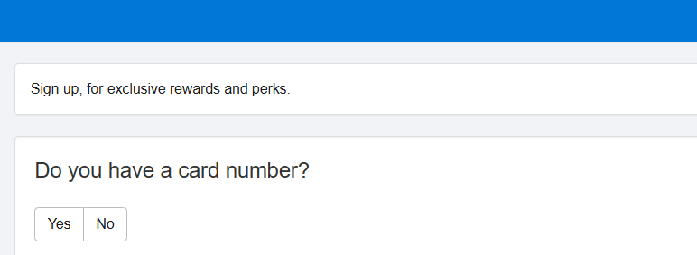 This widget supports two sign-up methods, each with its own configurable options. At the start of the sign-up journey the question "Do you have a card number?" is asked: