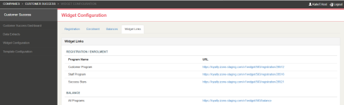 The Widget Links tab lists all URL for the Widgets available within the company. These links can be added to your website to provide customers with direct access to the relevant customer journeys.