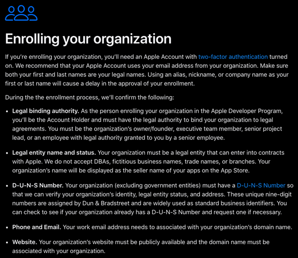 Apple Developer Account needs to be created for your Organisation. To enrol use the following link https://developer.apple.com/programs/enroll/