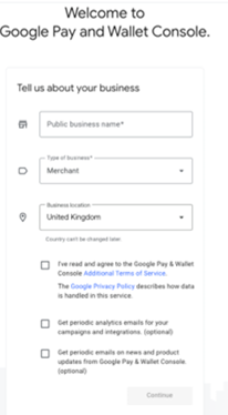Google Pay & Wallet - A Google Pay & Wallet Console Account is required. This account needs to be linked the Business Google Play Account. This can be created via the following link https://pay.google.com/business/console/ . Ensure the correct information and Terms & Conditions are used.