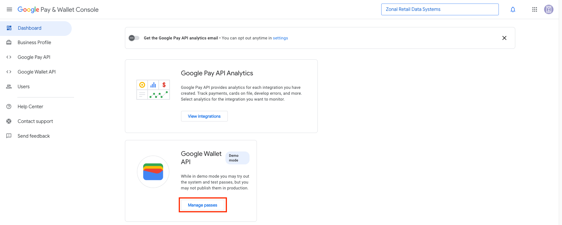 From the Dashboard select the Manage Passes option in the Google Wallet API section