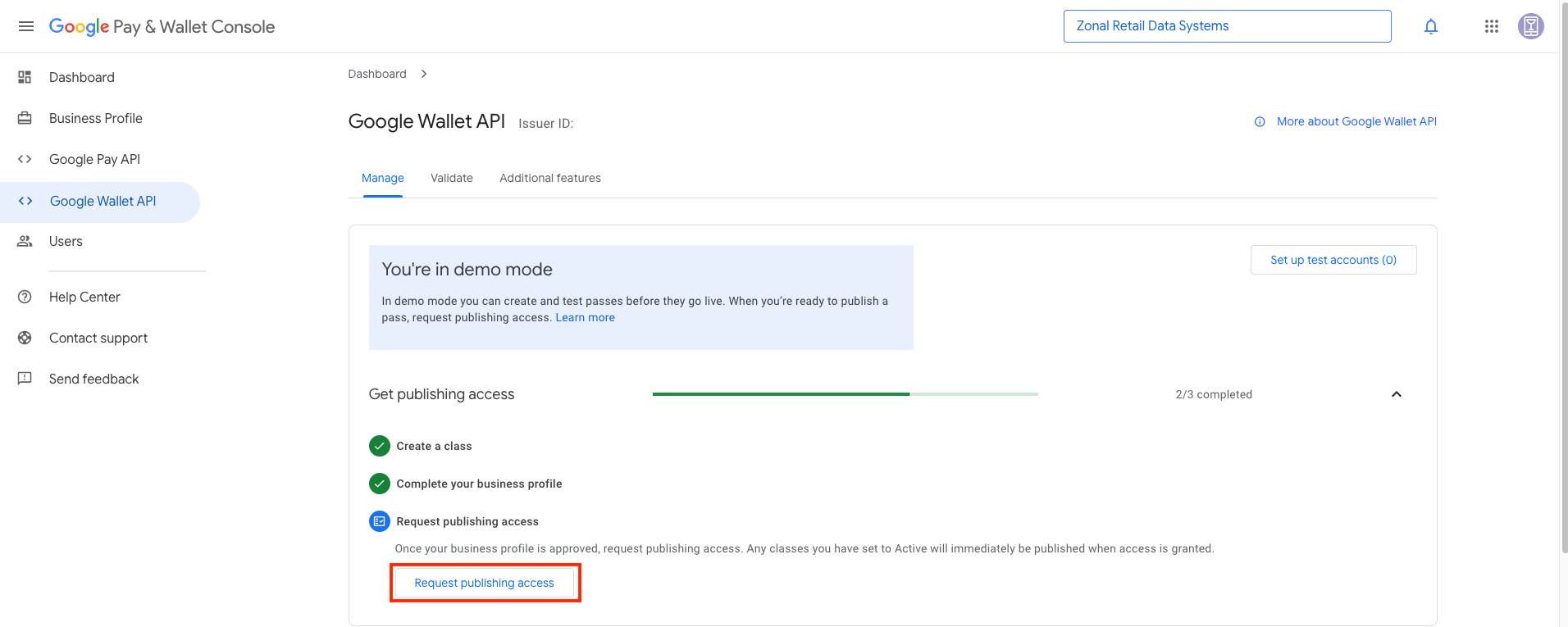 This page explains how to obtain publishing access from Google, allowing your guests to add their loyalty cards to Google Wallet. It assumes that Google credentials, created by Zonal, have already been provided and that a pass template has been created. Please confirm these steps have been completed before continuing.
