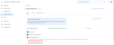 You will see that before you can request Publishing Access there are 2 steps to be completed (Create a Class & Complete your Business Profile). Both of those should already be complete as these are required to generate the credentials needed to save a template in Pass Creator