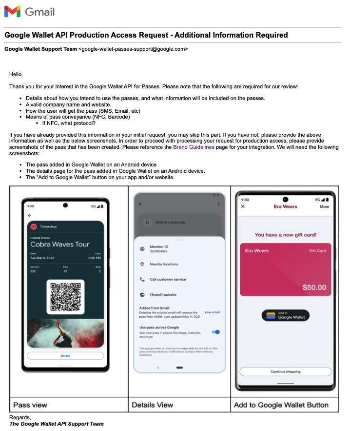 Screen shots of the Add to Wallet button from the email sent to the user and / or the Balance Widget (this is for Google to verify that the correct button with the correct dimensions is being used)