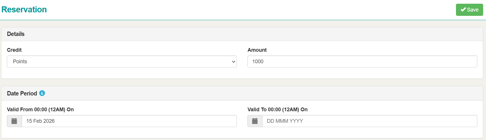 Credit and Amount fields require the credit value type (points or currency) to be chosen and the amount of points/ currency that will be gained for the reservation made.