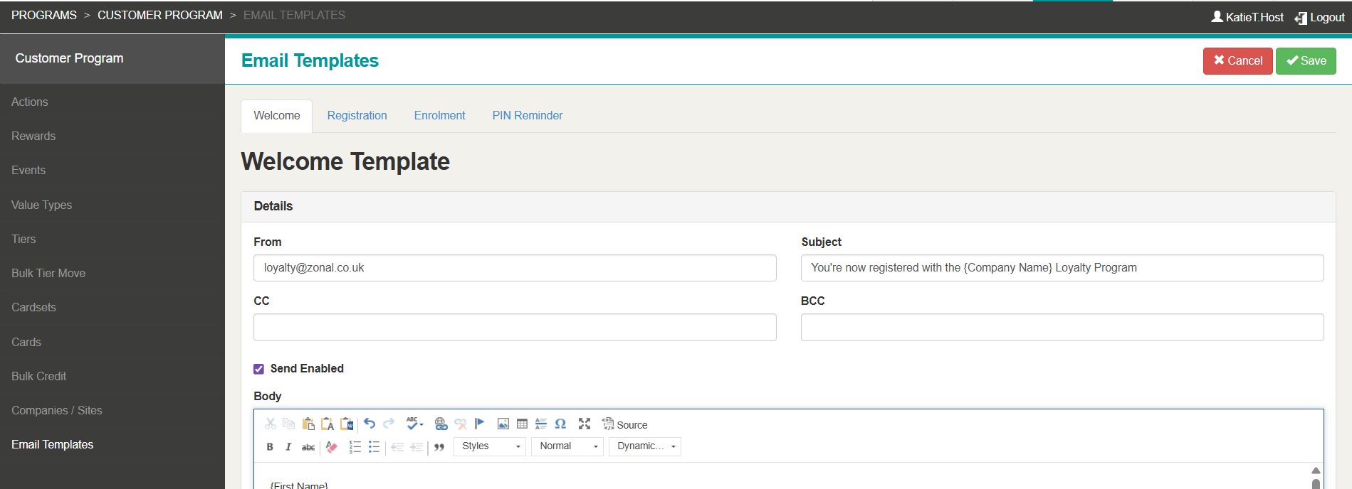 Select the required template tab: Welcome, Registration, Enrolment, PIN Reminder