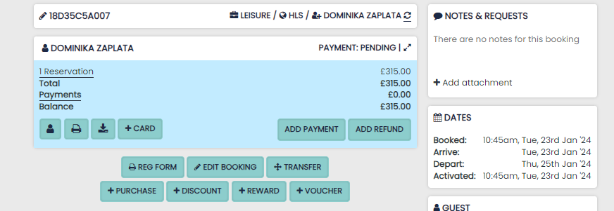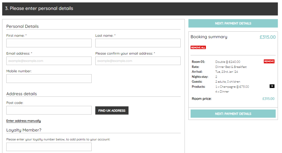 Staff members have the ability to skip this step by selecting ‘confirm booking’ depending on the sites settings. Guests creating reservations will have to enter payment details in order to complete their booking journey. for more information please visit our Module on Payment Gateway.