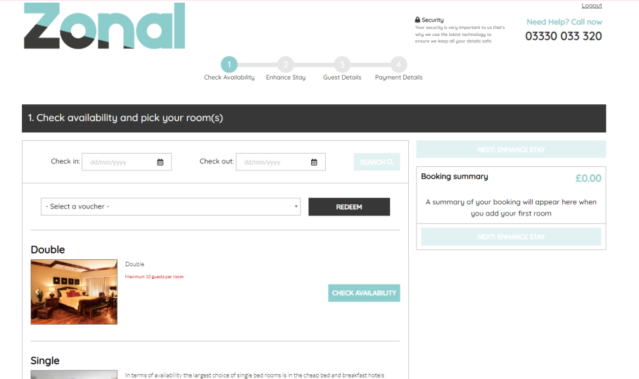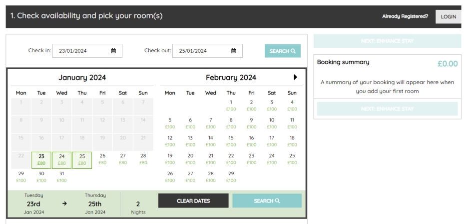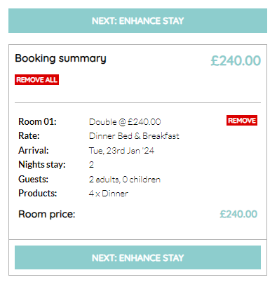 The reservation will appear under the ‘Booking Summary’, to continue to the next step select ‘next: enhance stay’.