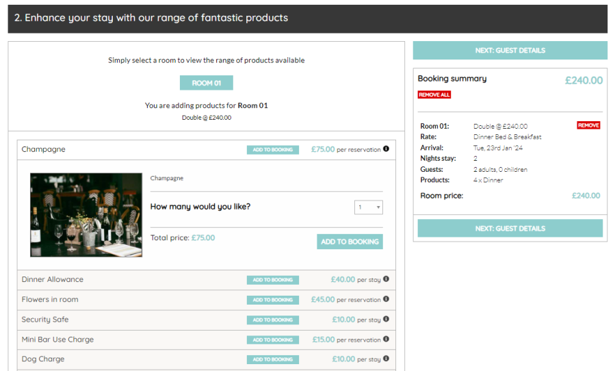 Here you will see a list of products which can be added to your booking. Click on the desired product to view a description and select quantity or simply select ‘add to booking’.