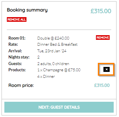 You will see the selected product within your booking summary, to remove you can click the ‘X’ button highlighted below. Clicking the red ‘Remove’ button will remove the room from the reservation.