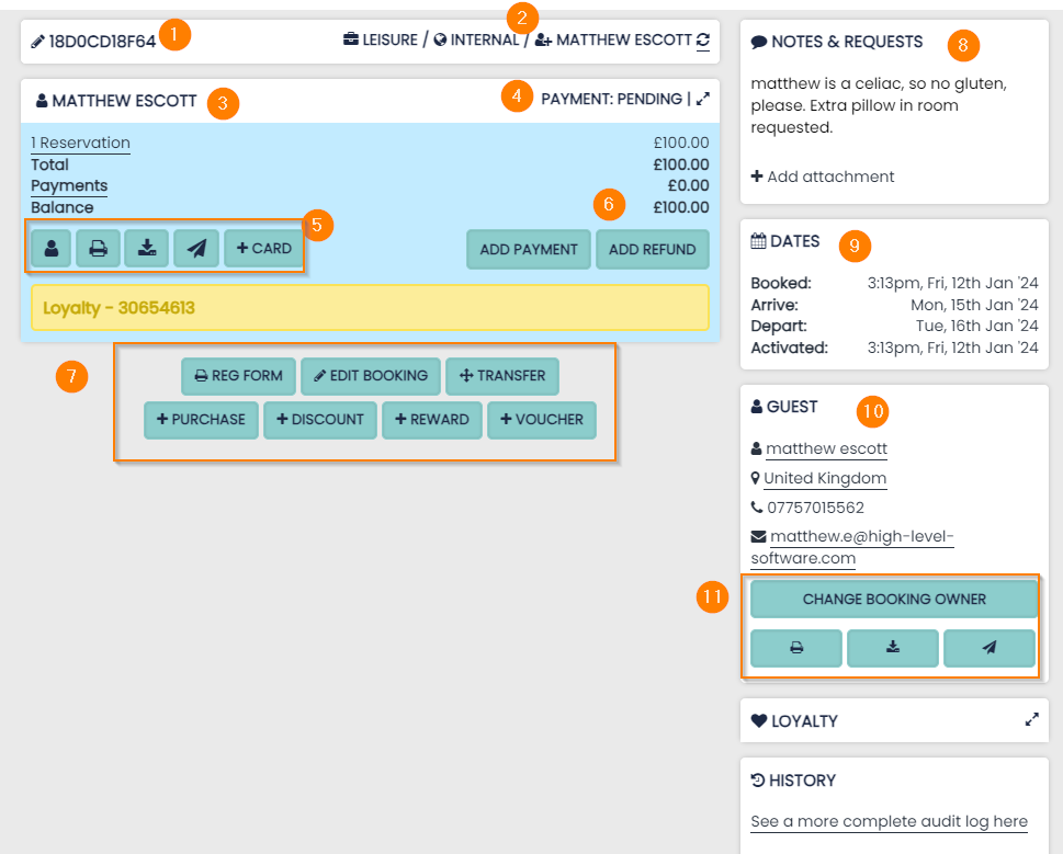 Below is an overview of the Booking Hub, this can be accessed in various places in the PMS by clicking any hyperlinked booking reference.