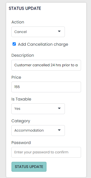 If you want to charge a cancellation fee, you can add this when changing the status of the booking, tick the below ‘add cancellation charge’, add a description, add a price (this will vary depending on your cancellation policy), and ensure to categorise it correctly (generally as accommodation unless you have a set category set up within the pms).