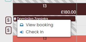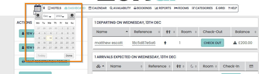 Additionally, guests can be checked in/out within the calendar. This can only be done if the guest is arriving/departing on the current day.
