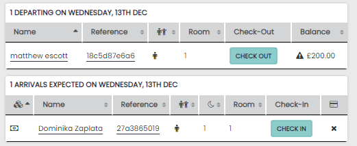 Guests can be checked in and out by simply clicking the action button – the system will display any reason why this cannot be completed i.e. an outstanding balance.
