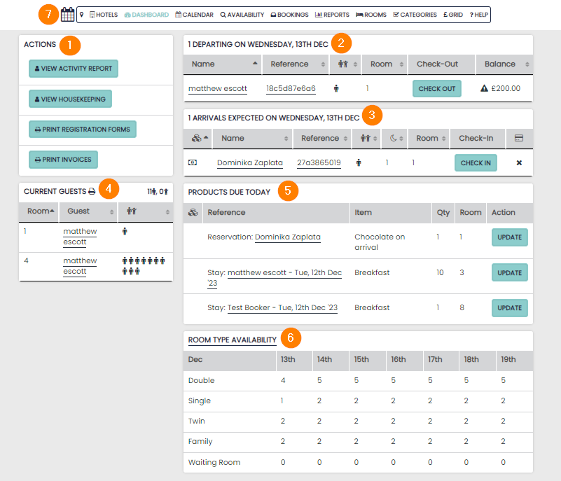 The Dashboard is the hub of the system and shows current status and all activity for the day, you'll be able to see current guests, perform check in and check out activities along with creating registration forms and printing invoices.