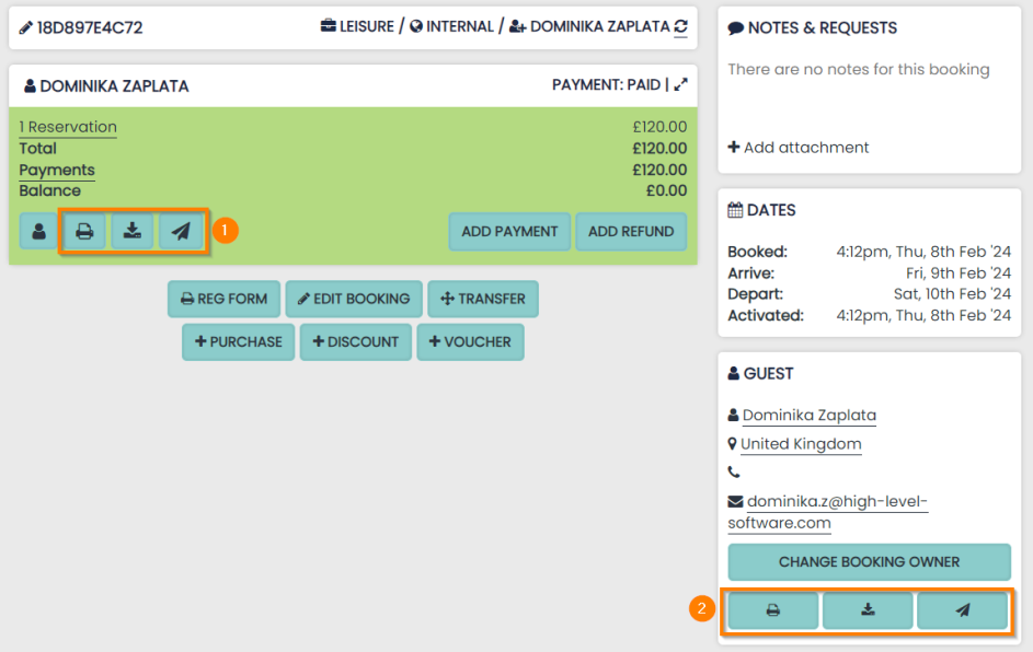 You can access Guest Invoices (1) and Guest Confirmations (2) within the Booking Hub.