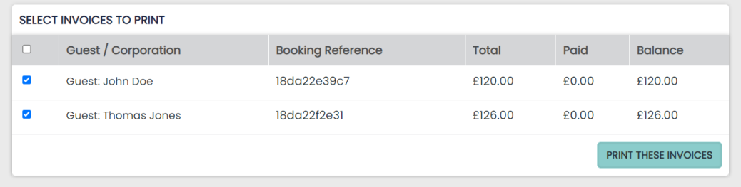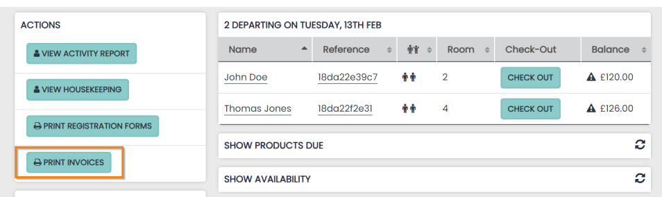 Any of the Bookings due to checkout can be selected from the bulk print panel.