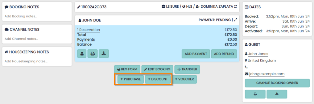 To add a Purchase or Discount item to a Reservation, go to the booking page and hit the ‘+Purchase’ or ‘+Discount’ buttons.
