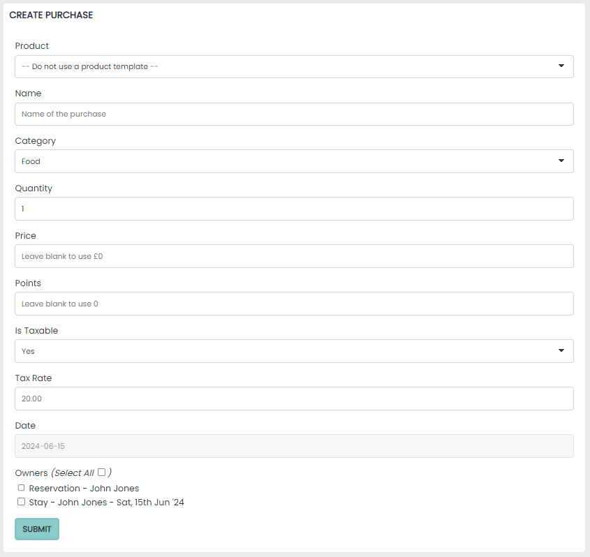A Purchase is a sale added to a Booking from your Products list. You can add a pre-set Purchase to a Reservation or create one ad-hoc if needed.