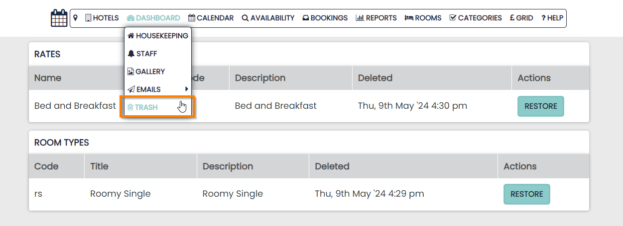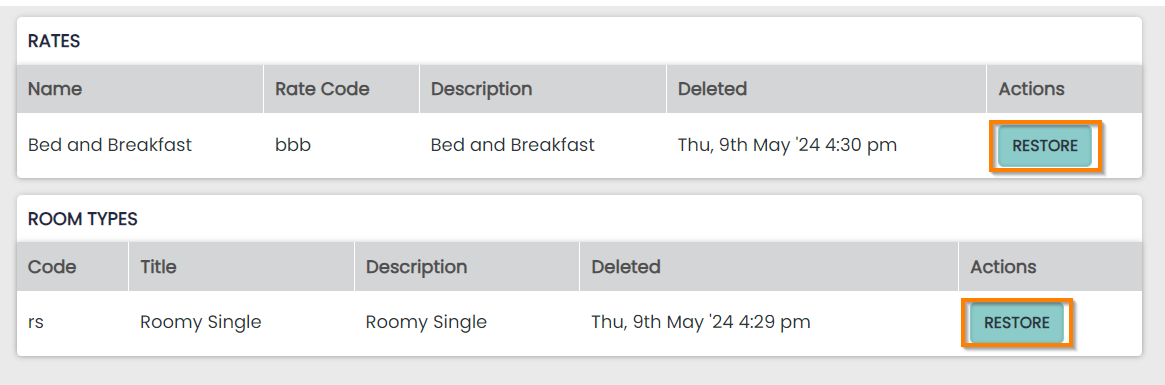 Any restored items will appear back on the related page. This is important as you may restore a Room, Rate Plan or Product that might go straight back on sale