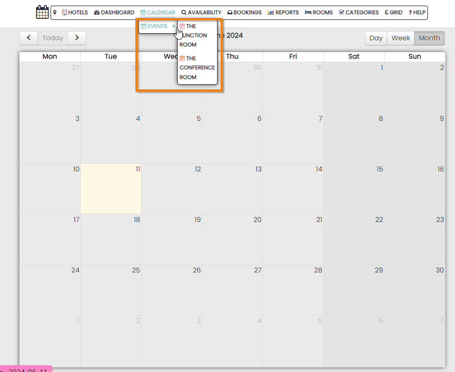 Bookings in the Venue calendars are called Conferences and are made in the same way as the Accommodation Calendar i.e. Simply click on the date that you wish the Conference to take place.