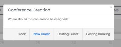 New Guest – as with accommodation bookings, conferences need to be assigned to a Guest Profile. This option will navigate the use to the Booking Engine and create a new profile if the email address is not already in use