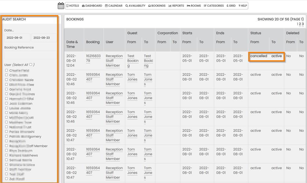 All changes will be highlighted in bold. We can see here that a Booking has changed from Cancelled to Active on 01 August at 12:04.