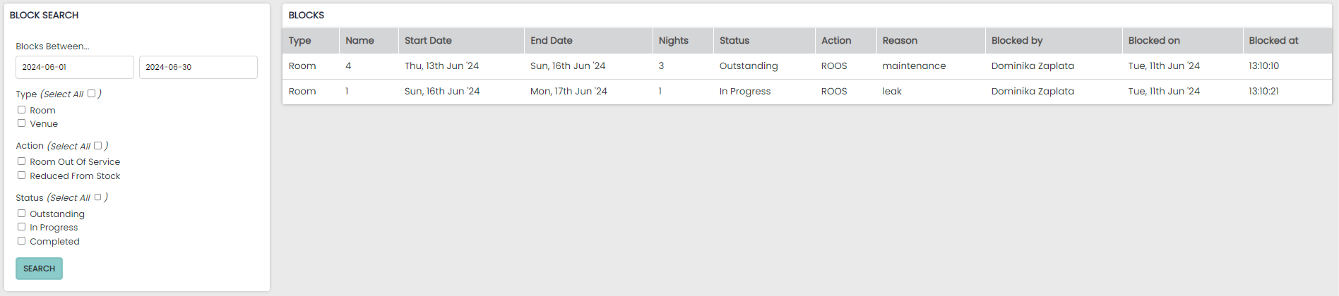 - Action - the filter will control the return of blocks that are Room Out Of Service or Reduced From Stock