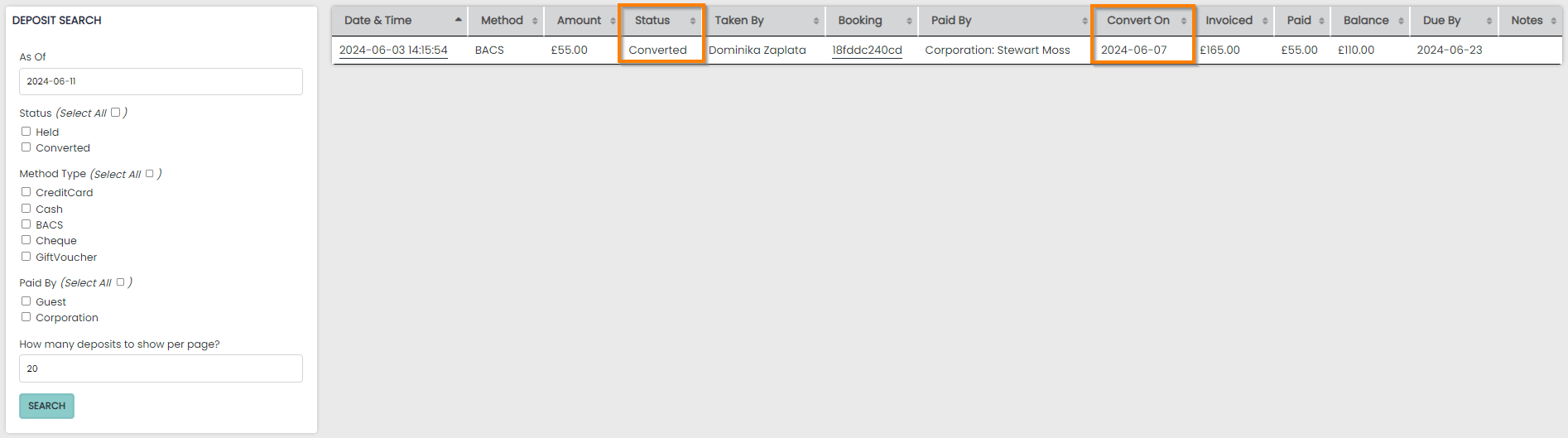 Each deposit will then carry a status of either Held or Converted. A deposit is held until the guest starts their stay at which point, it is converted to a regular payment.