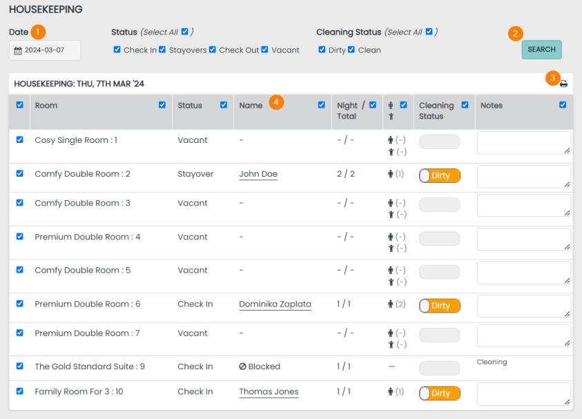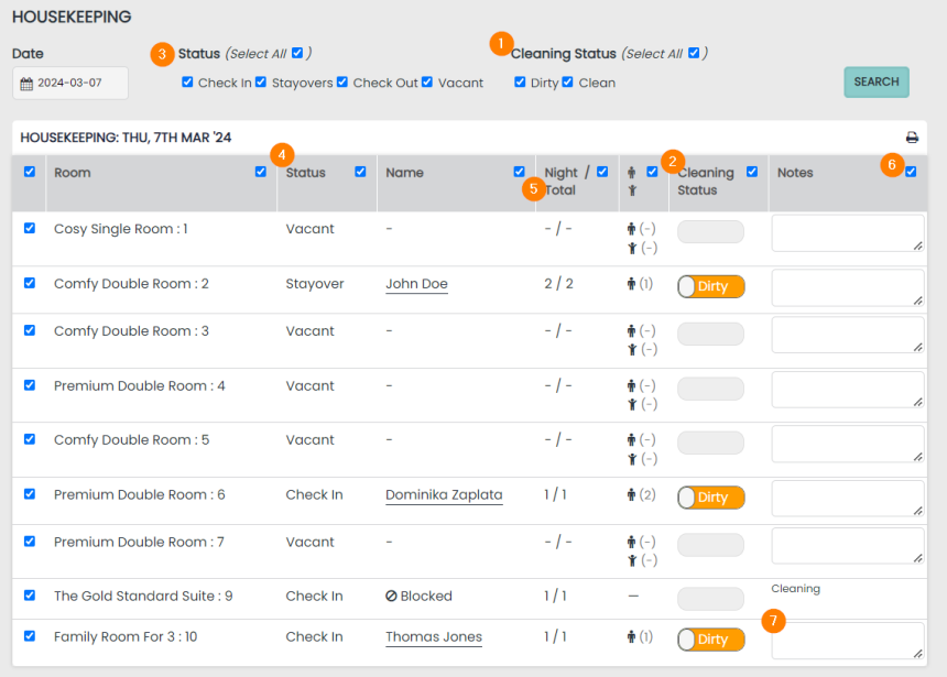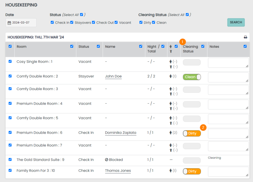 The cleaning status will NOT prevent a user from checking a guest in/out. The status column is a visual flag for all operators to see if the room is dirty or clean.