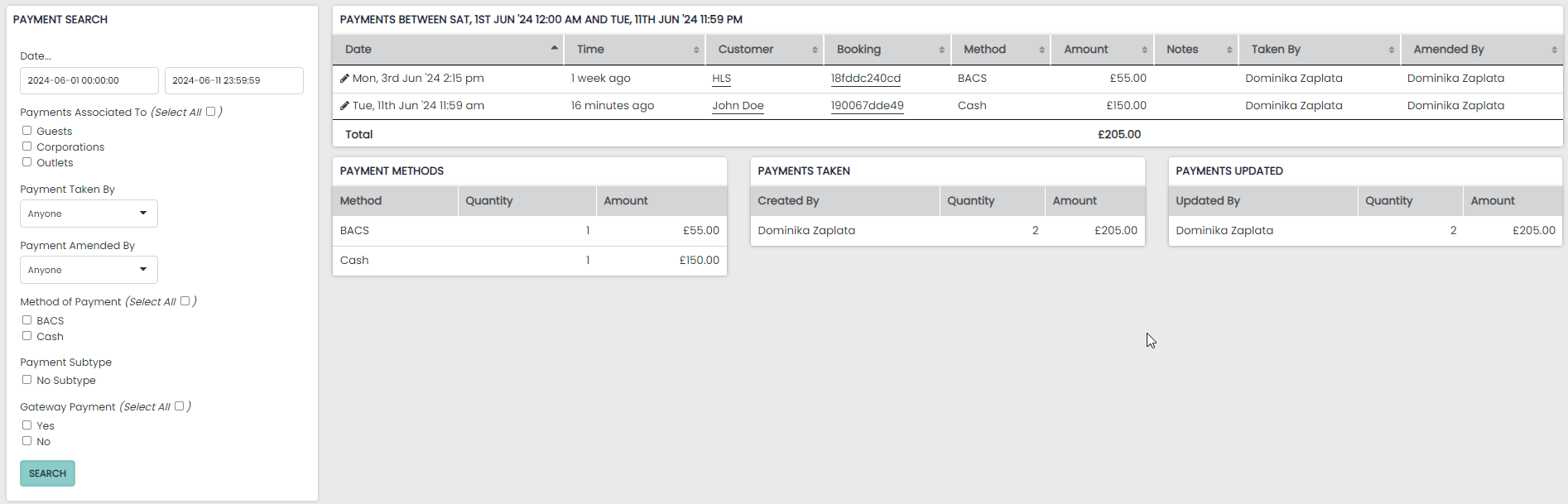 Each payment will be listed with a hyperlink to the Guest profile and the Booking it was recorded on.