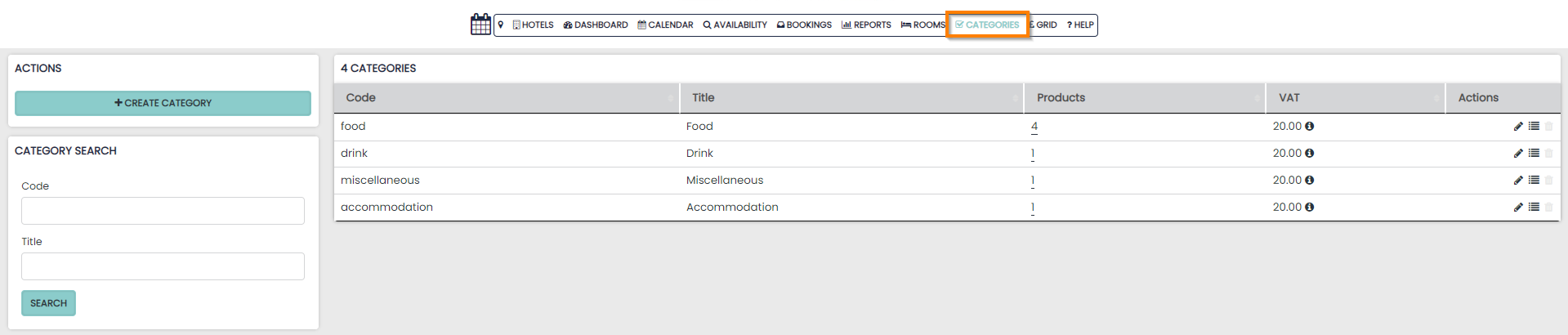 The Categories section is found on the Navigation bar and will allow you to assign any sales made in the system to Hotel specific categories.