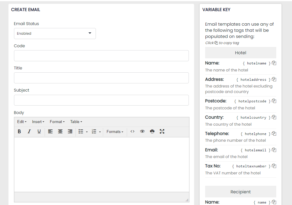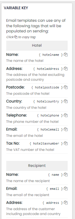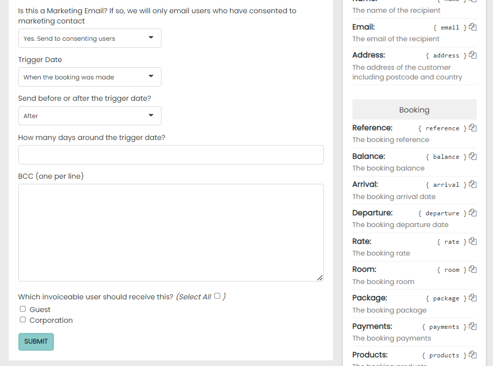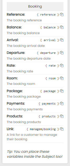 When creating or editing a template, be aware of the variables available to use which will transpose information from the Booking into your email content.