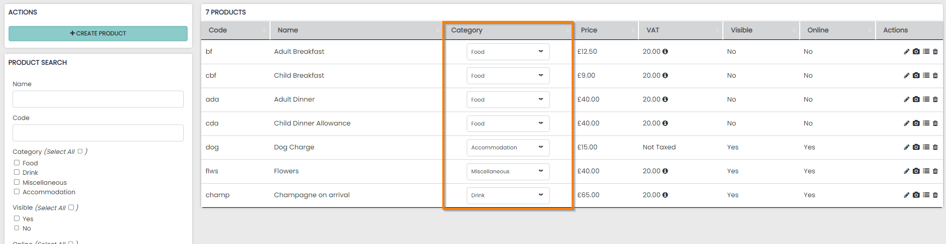 The Category column will display the revenue category that has been assigned to the Product. All Products must be assigned to a Category when created.