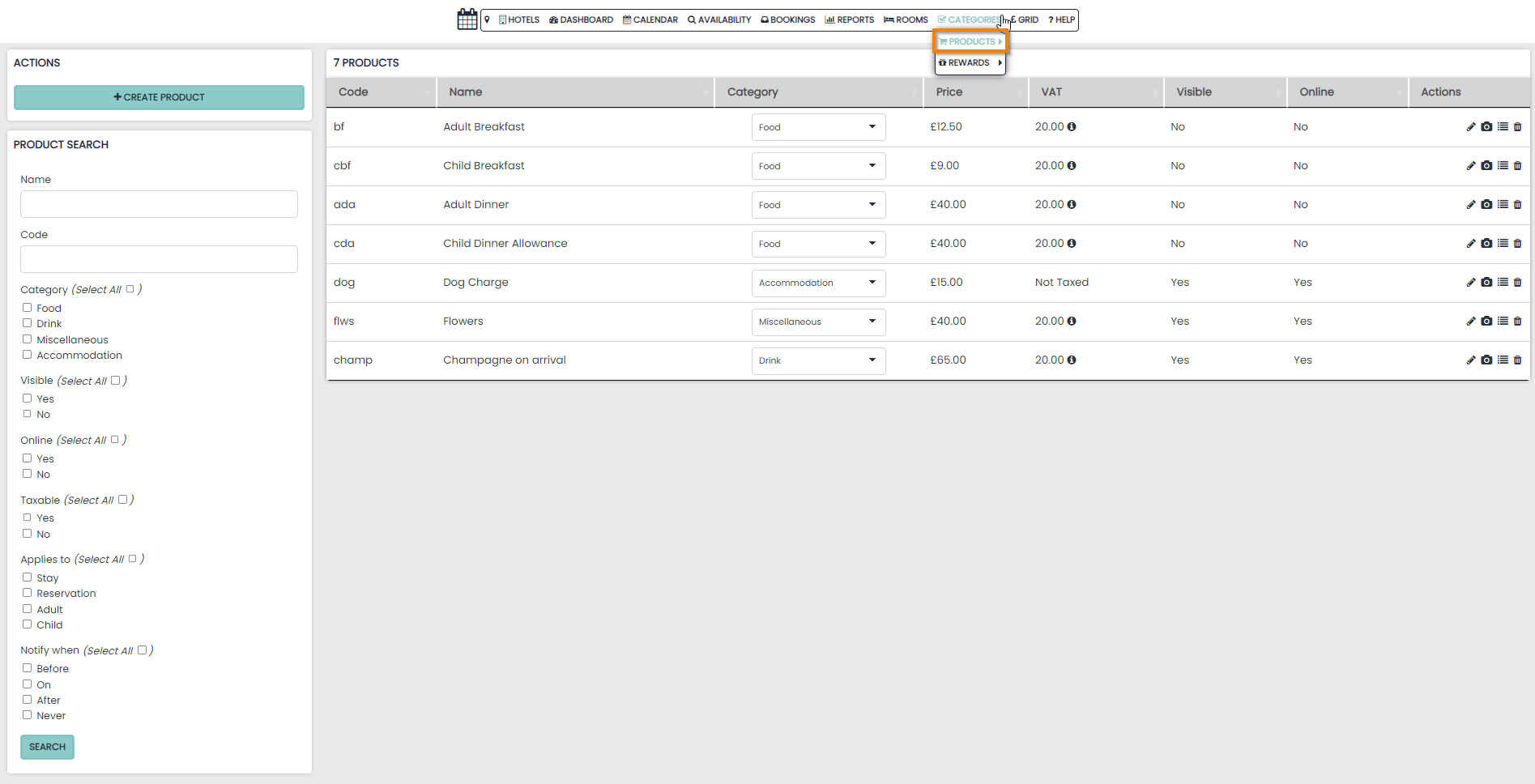 The Products section is found in the Categories drop down menu on the Navigation bar and will allow you to create and manage all Products in the system.